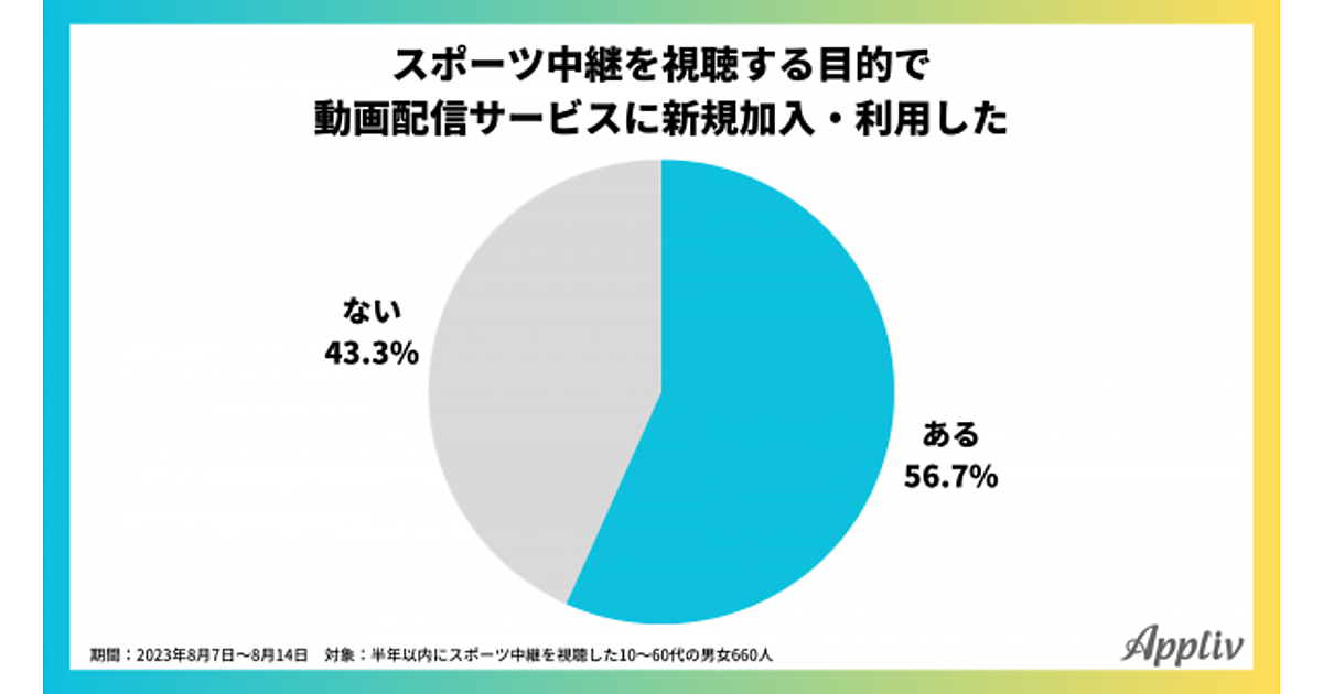 まず、スポーツ中継を視聴する目的で動画サービスに新規加入・利用した経験があるかを聞くと、56.7%の人が「ある」と回答した。