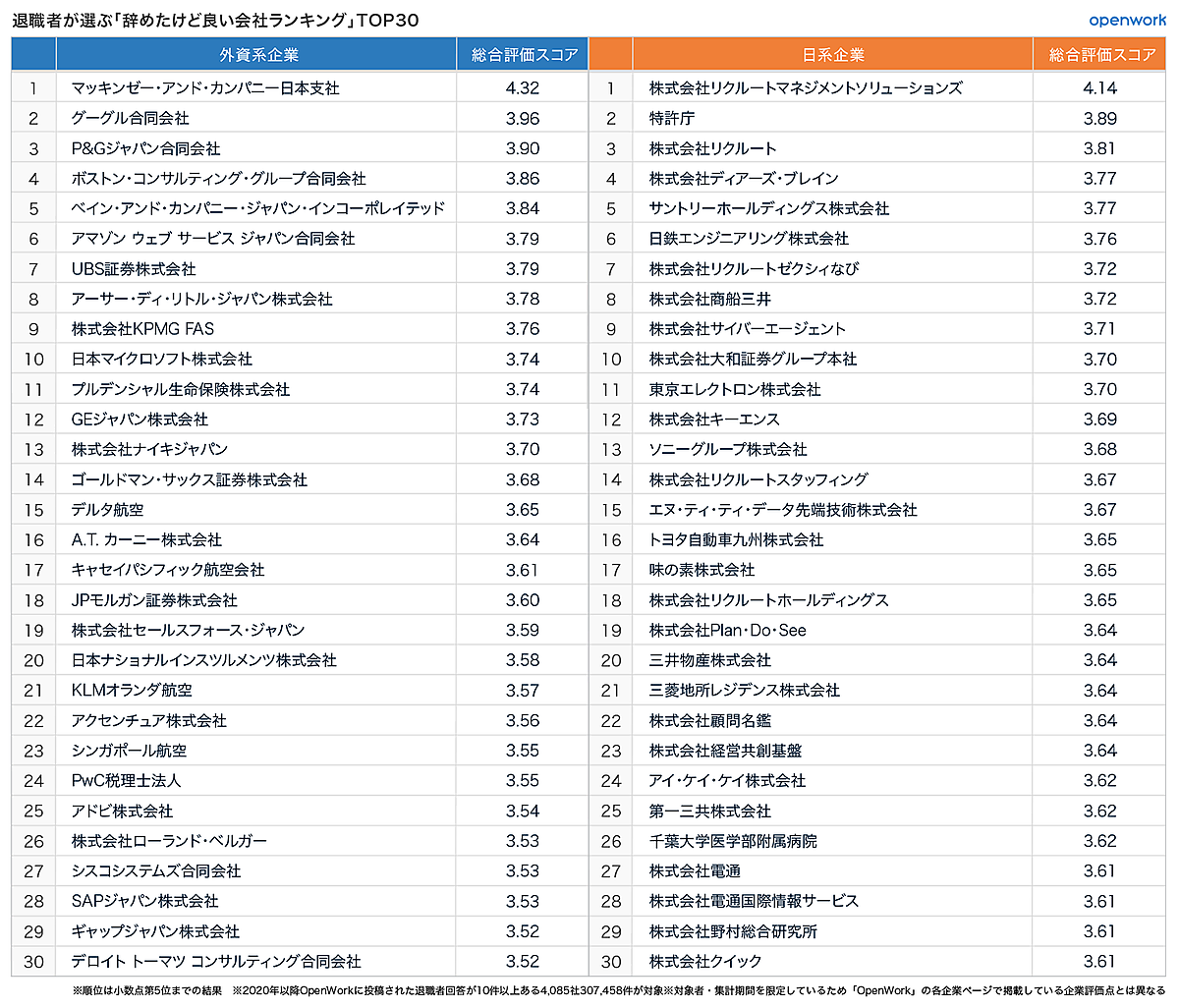 オープンワーク(OpenWork)は、「辞めたけど良い会社ランキング」を発表した。OpenWorkに退職者からの投稿が10件以上ある外資系企業・日系企業それぞれについて分析を行った。4,085社、307,458件のクチコミが対象。