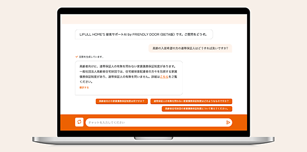 不動産情報サービス事業のLIFULL(ライフル)は、同社が提供する不動産・住宅情報サービス「LIFULL HOME'S」でAI(人工知能)チャットを活用した「接客サポートAI by FRIENDLY DOOR(BETA)」の提供を始めた、と8月29日に発表した。米国オープンAIが開発・提供する生成AI「ChatGPT」を活用して住宅弱者に関する基礎知識や住宅探しの接客知識のうち、まず高齢者と外国籍居住者に関する知識を不動産会社向けに提供する。