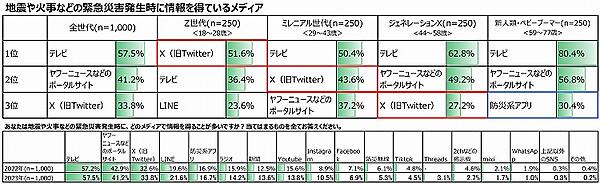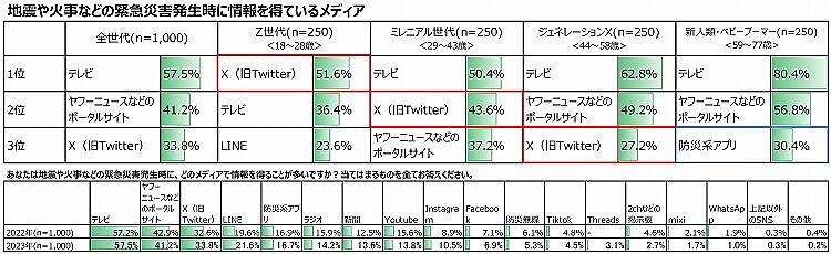 「地震や火事などの緊急災害発生時に、どのメディアで情報を得ることが多いか」を聞くと、「テレビ」57.5%が最多で、「ヤフーニュースなどのポータルサイト」41.2%、「X(旧Twitter)」33.8%がそれに続く。世代別だと、Z世代は「X(旧Twitter)」51.6%が最多で既存メディアより活用されている。また新SNSである「Threads」をあげたユーザーが3.1%存在した。