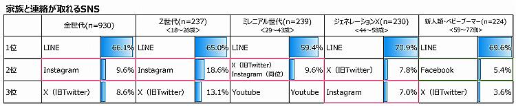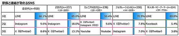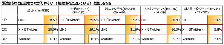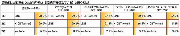 一方「災害時にもっともつながりやすい(接続が安定している)と思うSNS」を聞くと、全体では「X(旧Twitter)」20.0%より「LINE」28.5%が多かった。「家族と連絡が取れるSNS」についても「LINE」66.1%が多い。若年層はInstagram、年配層はFacebookをあげる人も多かった。
