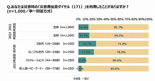 なお災害時には、“声の伝言板”として利用できる「災害用伝言ダイアル(171)」が提供されるが、利用率は全世代で15.5%にとどまる。ただし世代別で見ると、意外にもZ世代の利用率25.2%が最も多かった。
