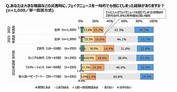 災害時には、さまざまなフェイクニュースが流行ることも多い。「フェイクニュースを信じてしまった経験」を聞くと、「頻繁にある」2.9%、「ときどきある」15.3%、「1回~数回程度ある」16.0%で、ほぼ3人に1人が信じてしまった経験を持っていた。世代別では若年層ほどフェイクニュースを信じてしまった割合が高く、Z世代では「1度以上信じてしまった」が45.6%ともっとも高かった。