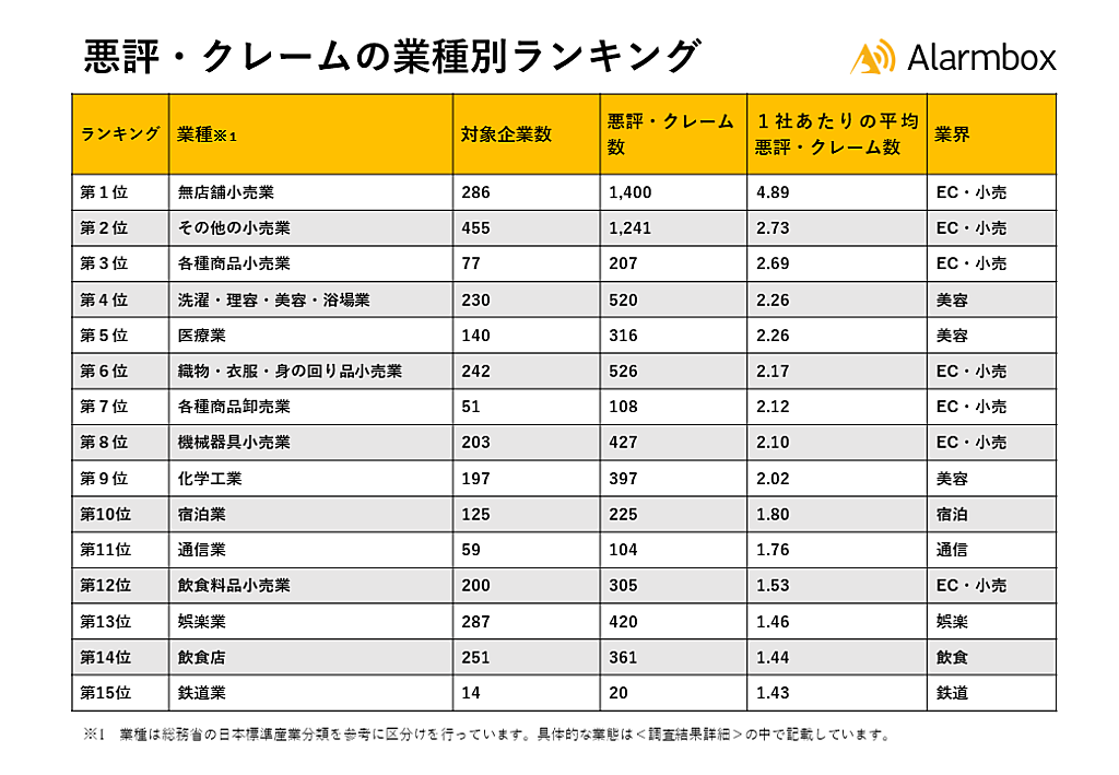 アラームボックスは、「インターネット上で悪評・クレームが多い上位10業種」について調査結果を発表した。2023年上半期においてネット投稿されたクチコミ・評判から悪評・クレームを抽出・集計している。10,410社が対象。