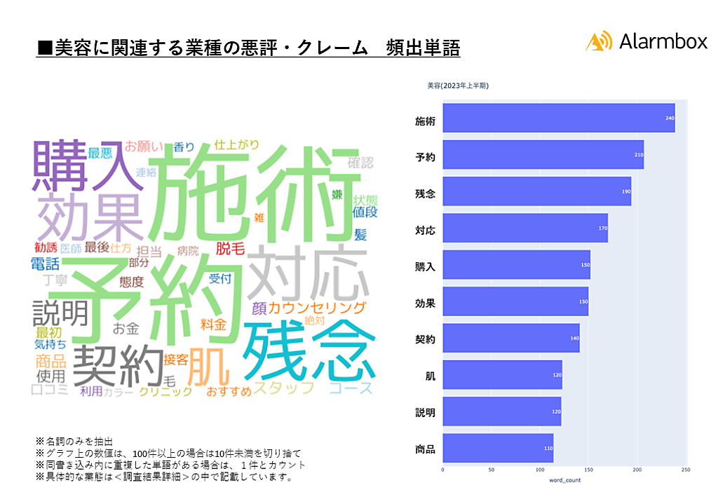 理美容、医療、化学工業など美容での最頻出単語は「施術」で「予約」がそれに続いた。「購入」「契約」など金銭トラブルを推察させるものも目立つ。