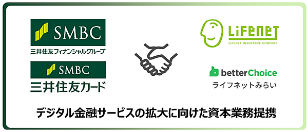 SMBCグループの三井住友フィナンシャルグループと三井住友カード、ライフネット生命グループのライフネット生命保険とライフネットみらいの4社は資本業務提携契約を締結した、と8月30日に発表した。ライフネット生命は第三者割当増資による新株式発行で三井住友カードに401万4000株を割り当てる。発行済み株式数に対する割合は5.75%。両グループの商品・サービスを連携してデジタル完結型の保険サービスの拡大を目指す。