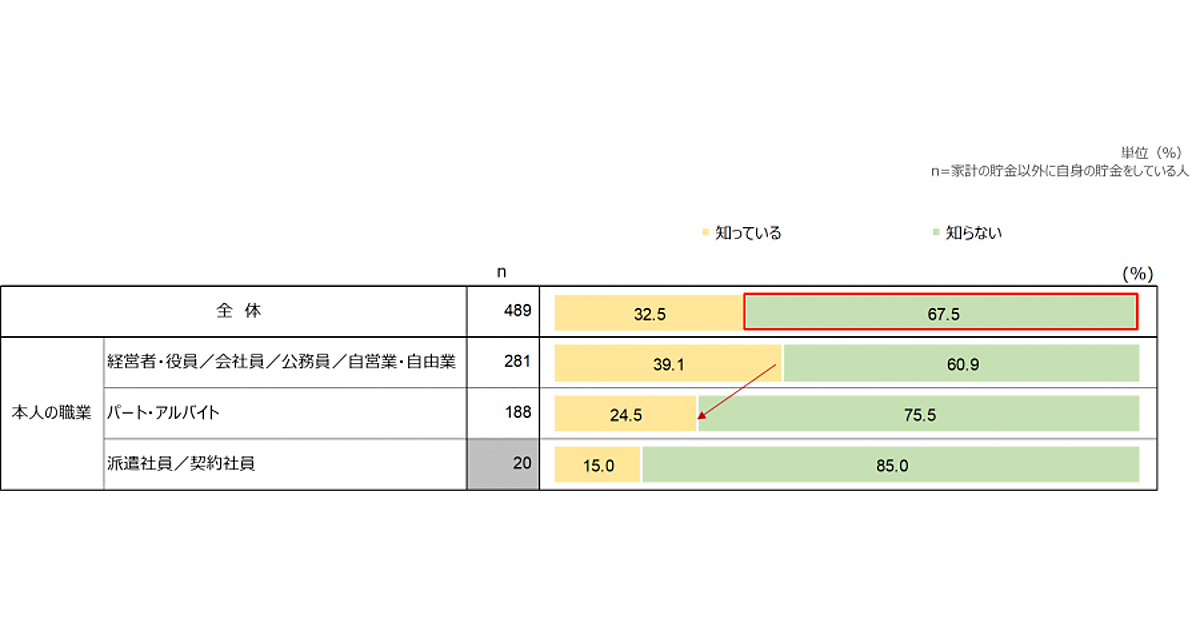 自分の貯金額を配偶者が知っているかを聞くと、7割弱の人が「知らない」と回答。自身の職業がパート・アルバイトや派遣社員・契約社員である方が貯金金額を共有していない割合が高かった。