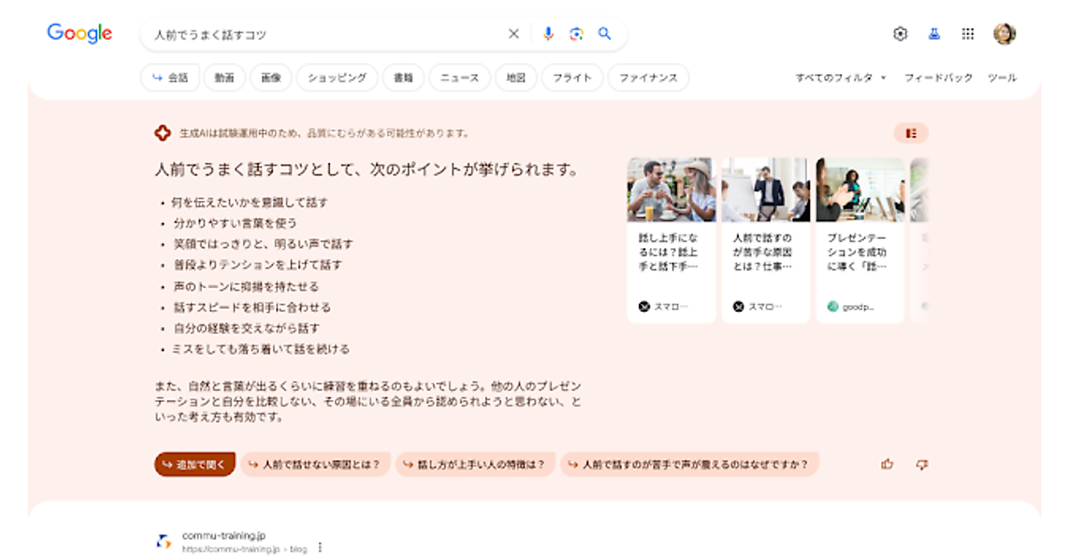 例えば「残暑見舞いはいつ頃送る? 」と質問すると、「残暑見舞いに何を送ったら喜ばれますか?」や「残暑見舞いのマナーは?」など追加で質問できる候補を提示する。これらの候補や「追加で聞く」を選ぶと新しい会話モードに移行して、調べているトピックについてさらに質問ができる。質問をかみ砕いた質問に分割して複数の情報源からの膨大な情報を整理し、つなぎ合わせる作業を生成AIが実行して検索結果に表示している。