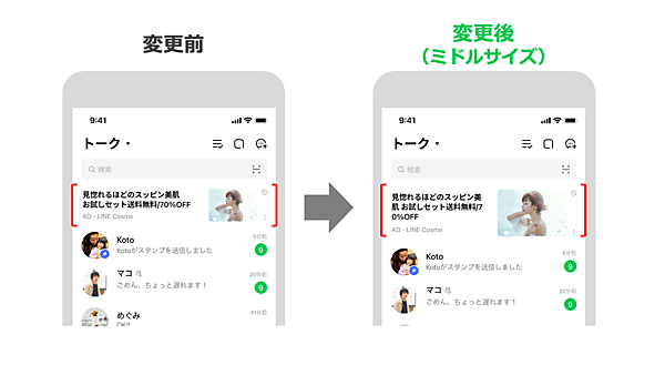 トークリストの広告サイズでミドルサイズを正式にリリースした。LINE広告と、トークリスト最上部に動画や静止画の広告を配信できる「Talk Head View」「Talk Head View Custom」で適用される。ミドルサイズの正式リリースによって、トークリストの広告表示枠が拡大され、テキストエリアに表示される文字数が増加する。トークリストでミドルサイズの広告は、これまでABテストを実施していた。