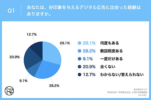 オリゾは、「SNS世代の好印象な広告」に関する調査結果を発表した。SNSを1日平均2時間以上触っているSNS世代(18歳~36歳)110人が回答している。