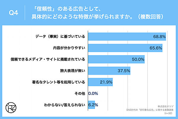 「信頼性がある」と回答した32人に、「信頼性のある広告として、具体的にどのような特徴が挙げられますか」と聞くと、「データ(事実)に基づいている」68.8%、「内容が分かりやすい」65.6%がとくに多く、「信頼できるメディア・サイトに掲載されている」50.0%がそれに続いた。