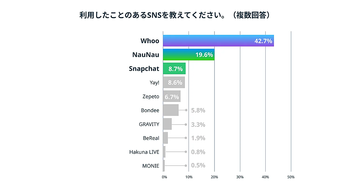 まず、TwitterやLINE、FacebookやTikTokといった一般的な既存SNS以外に、「新興SNSで利用したことがあるもの」を聞くと、1位は「Whoo」42.7%が圧倒的な支持を集めた。