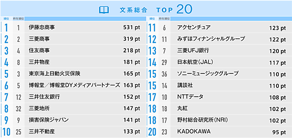 文系総合ランキング1位は「伊藤忠商事」。対面型での自社イベントに加え、SDGsの展開を学ぶ企画「ミライテラス」を朝日新聞社と共催で実施したことなどが評価された。2位「三菱商事」、3位「住友商事」はインターンシップ/ワークショップが評価されたという。トップ3を総合商社が占めているが、採用の早期化・学生のエントリー数減少といった動きを受け、地道な活動に注力したことが奏功したと見られる。