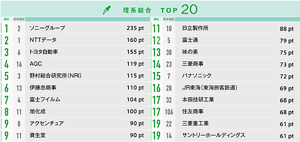 理系総合ランキングでは「ソニーグループ」が1位。2週間のインターンシップはコースの種類が100超におよび、充実した内容が支持された。2位「NTTデータ」もワークショップ型/プロジェクト型の2種類のインターンシップを用意し、約800名の参加者を募集していた。