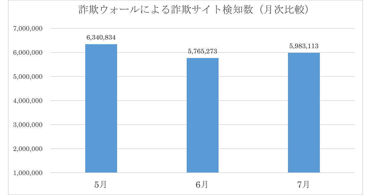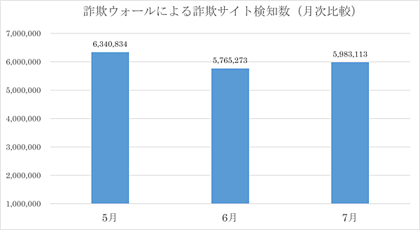 それによると、2023年7月における「詐欺ウォールによる詐欺サイト検知数」は598万3,113件。5月から大きく減少した6月と比較し21万7,840件増加しており、再びプラス傾向に転じている。