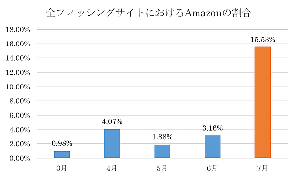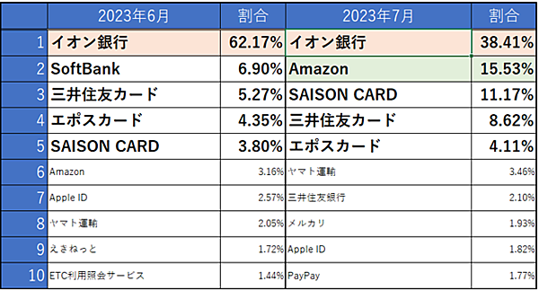 ブランドで見ると、7月度も「イオン銀行」のフィッシングサイトが1位だったが、実数ベースでは3分の1まで減少。一方でAmazonは12ポイント増加し、実数ベースで2倍以上となった。