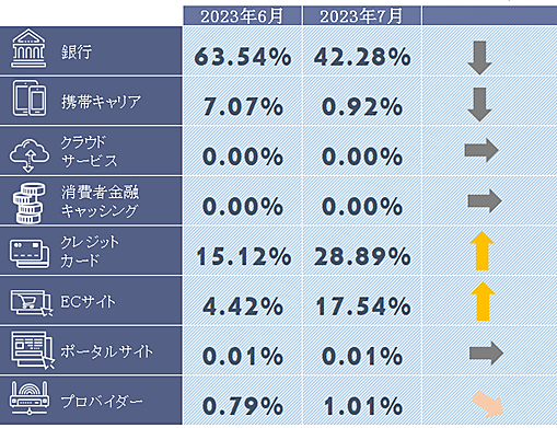 カテゴリ別を見ると、イオン銀行の報告数が減少したことで「銀行」カテゴリ全体が20ポイント以上も減少。一方で例年7~9月にかけてはボーナス商戦や夏休み需要などを狙うネット詐欺が増加するため、引き続き金融系の詐欺には注意が必要だ。