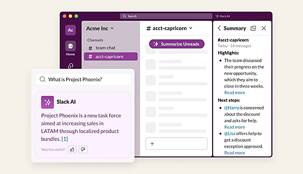 Slack AIは、Slackの対話型インターフェースに人工知能(AI)を組み込むことで作業を効率化する機能。チャンネルの要約、スレッドの要約、回答の検索に活用できる。Slack AIが顧客データをモデルトレーニングに利用することはなく、Slackのユーザー企業間でのデータの共有もされない。今冬にパイロット版の提供を始める予定となる。