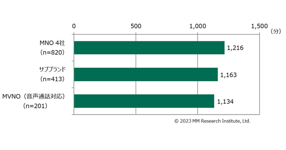 調査によると、1週間あたりのスマートフォン利用時間(通話時間を除く)は平均1,189分(約20時間)。携帯キャリアのブランド別で見ると、MNO4社では1,216分、サブブランドでは1,163分、MVNOでは1,134分となった。