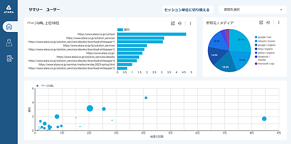 デジタルマーケティング支援事業のアタラは、ウェブページのコンバージョン(最終成果)貢献度を数値化したレポート「GA4コンテンツ・アトリビューション・ダッシュボード」の提供を始めた、と9月13日発表した。ページ(URL)ごとに数値化し、各チャネルから流入した後、どのページがどの程度コンバージョンに貢献したか可視化してレポートにまとめる。