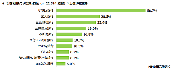 「銀行口座」は90.1%(22,514人)が利用。「ゆうちょ銀行」58.7%がもっとも多く、「楽天銀行」28.5%、「三菱UFJ銀行」25.9%が上位だった。