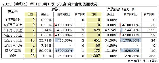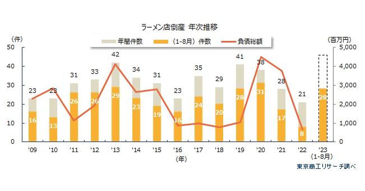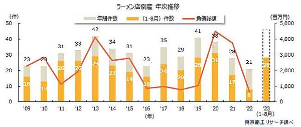 東京商工リサーチは、「ラーメン店の倒産動向」に関する調査結果を発表した。日本産業分類の「ラーメン店」の2023年1月~8月の倒産を集計・分析している。