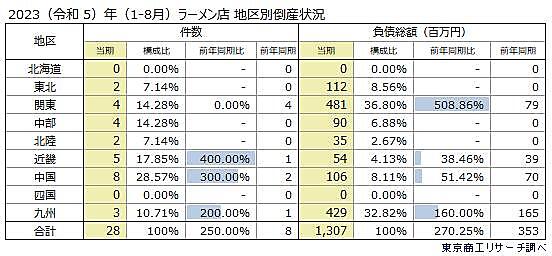 地区別では、最多は中国地方の8件(前年同期2件)。以下近畿の5件、関東4件と中部4件が続いた。都道府県別では、広島が最多の4件(同ゼロ)だった。大阪と福岡の各3件など、ご当地ラーメンも多い西日本を中心に、倒産が発生しているとのこと。