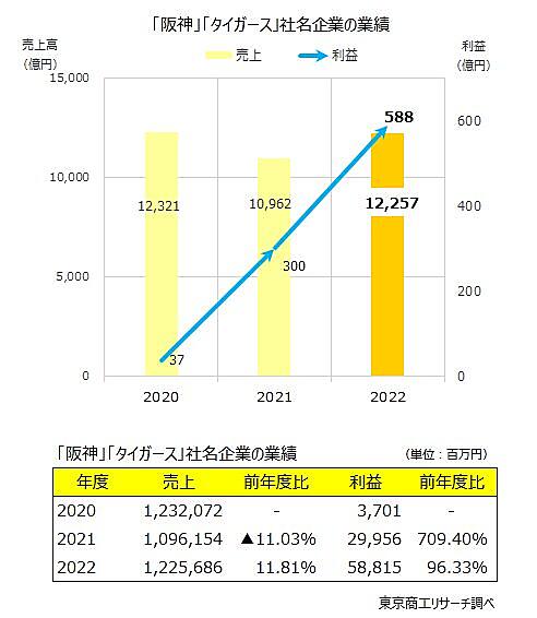 それによると、「阪神」または「タイガース」が社名に付く企業の多くは、売上高は横ばいながら、利益(最終利益)は急上昇していたという。これら企業について、2020年度(2020年4月~2021年3月)の利益合計は約37億円だったが、2021年度は約300億円、2022年度は588億円と、コロナ禍の3年で約16倍の増益を実現していたとのこと。