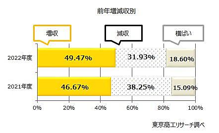 売上高の増減収別では、2022年度は増収141社(構成比49.4%)と半数近くが増収だった。一方、減収は91社(同31.9%)、横ばいも53社(同18.6%)にとどまった。コロナ禍の影響が強い前期(2021年度)は、増収133社(同46.6%)、減収が109社(同38.2%)、横ばいが43社(同15.0%)だった。