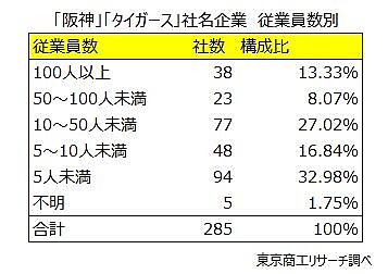 なお従業員数を見ると、10人未満が142社(同49.8%)と半数近くを占め、「阪神」「タイガース」社名企業の多くが中小・零細企業だった。