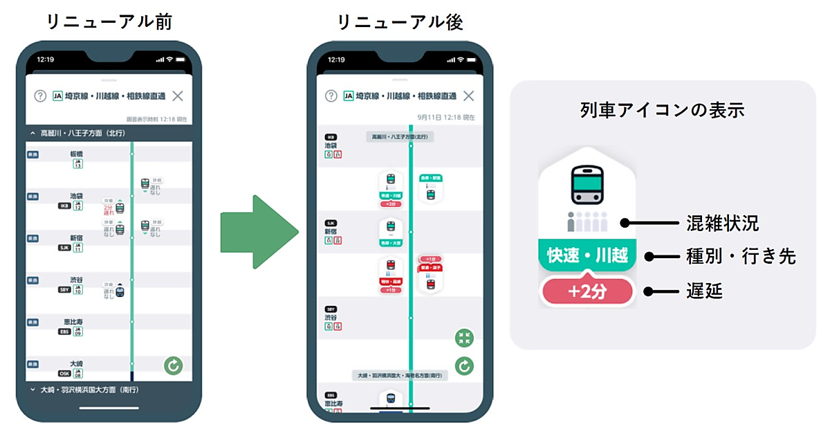 JR東日本は、スマートフォン用アプリ「JR東日本アプリ」をアップデートし、「列車走行位置」の機能で走行している列車ごとの情報をまとめて確認できるようリニューアルした、と9月25日に発表した。リアルタイムの列車走行位置や遅延状況に加えて、混雑状況も列車ごとに確認できる。さらに各列車の種別・行き先の情報もまとめて確認できる。
