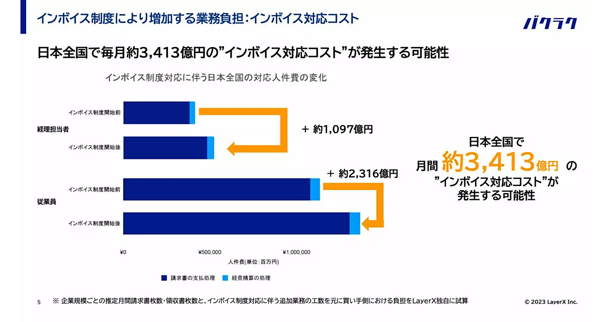 法人支出管理サービス「バクラク」を提供するLayerXは、2023年10月1日に始まるインボイス制度(適格請求書等保存方式)に向けて「インボイス制度対応により増える業務」に関する分析結果を発表した