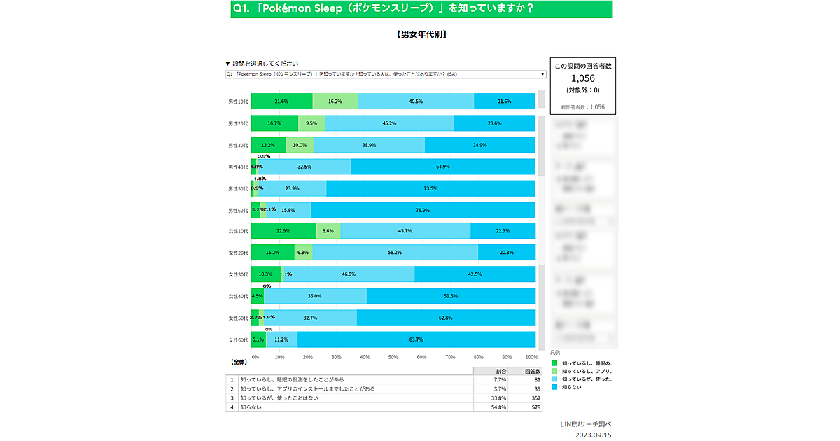 LINEリサーチは、ポケモンからリリースされた睡眠ゲームアプリ「Pokémon Sleep(ポケモンスリープ)」に関する調査を実施した。認知率や利用経験率について、全国の男女1,056名に聞いている。