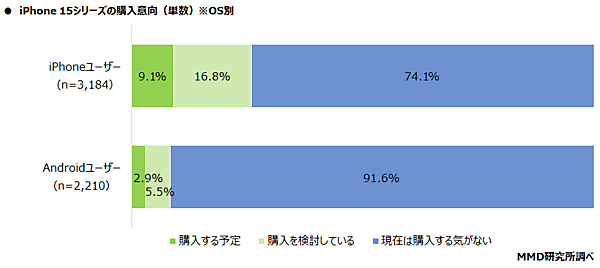 MMDLabo株式会社が運営するMMD研究所は、「iPhone 15シリーズに関する購入意向調査」の結果を発表した。15歳~69歳の全国の男女6,000人(iPhoneユーザー3,184人とAndroidユーザー2,210人を含む)が予備調査に回答、iPhone 15シリーズ購入意向者481人が本調査に回答している。