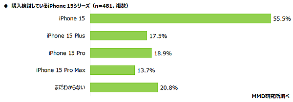 購入意向者481人に「購入を検討しているシリーズ」を聞くと、「iPhone 15」が過半数で「iPhone 15 Pro」「iPhone 15 Plus」がそれに続いた。