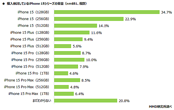 容量も合わせて見ると、「iPhone 15(128GB)」34.7%が最多で、「iPhone 15(256GB)」22.9%、「iPhone 15(512GB)」14.1%がそれに続く。最新機種は欲しいがProより無印、できるだけ小容量モデルで価格を抑えようとしている様子がうかがえる。