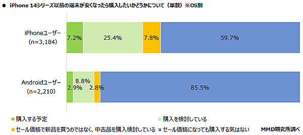 あらためて全体に「旧モデルのiPhone 14シリーズ以前の端末が安くなったら購入したいか」を聞くと、iPhoneユーザーの32.6%、Androidユーザーの11.7%が、「購入する予定+購入を検討している」と回答した。一方「セール価格になっても購入する気はない」はiPhoneユーザーの59.7%、Androidユーザーの85.5%だった。