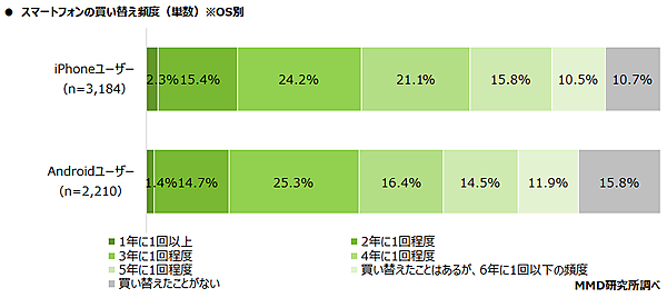 また「スマートフォンの買い替え頻度」を聞くと、iPhoneユーザーは「3年に1回程度」24.2%ともっとも多く、「4年に1回程度」21.1%が続く。Androidユーザーも「3年に1回程度」25.3%がもっとも多い。「3年に1回以上」の割合はiPhoneユーザー41.9%、Androidユーザー41.4%となった。