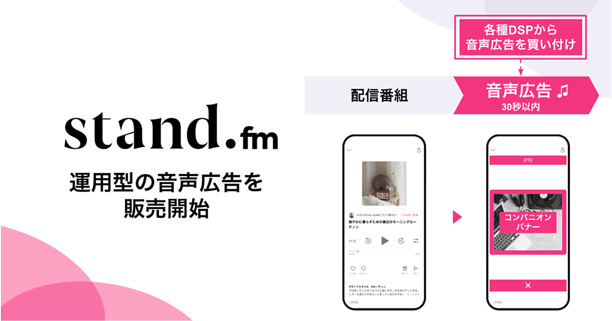 stand.fmは、誰でも気軽に収録してすぐに配信できる音声配信アプリ。お笑い芸人からスポーツ選手まで幅広い配信者の番組をラジオ感覚で楽しめ、リスナーは若年層からシニアや主婦層まで幅広い。音声広告は番組コンテンツ間に15秒、20秒、30秒で配信。コンパニオンバナーも同時に表示され、クリックすると指定リンク先に遷移できる。