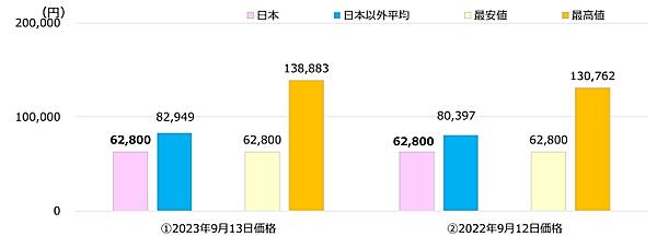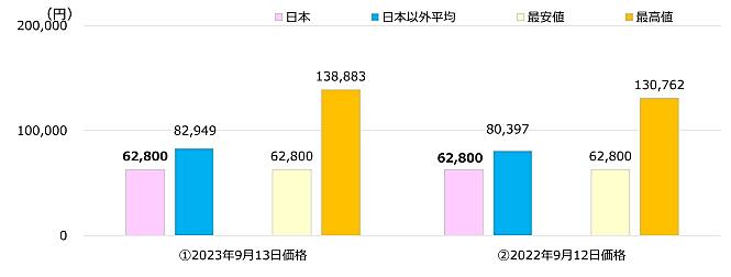 その結果、iPhone 15シリーズの日本販売価格は、iPhone 15(124,800円)、iPhone 15 Plus(154,800円)、iPhone 15 Pro(204,800円)、iPhone 15 Pro Max(249,800円)で、iPhone 15を除く3モデルは38の国・地域のなかで最安だった。なおiPhone 15の最安は中国で、日本は2番目に安い国だった。