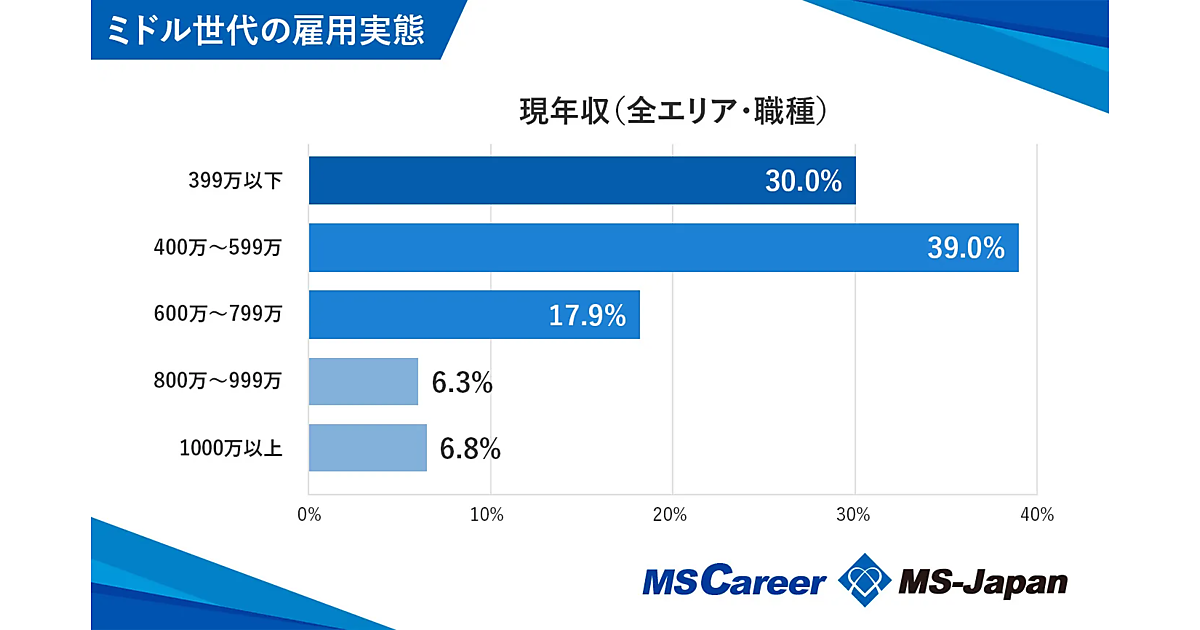MS-Japanは、「ミドル世代の雇用実態レポート」を発表した。30~49歳の転職希望者をミドル世代と定義し、現年収の平均や職種について調べている。