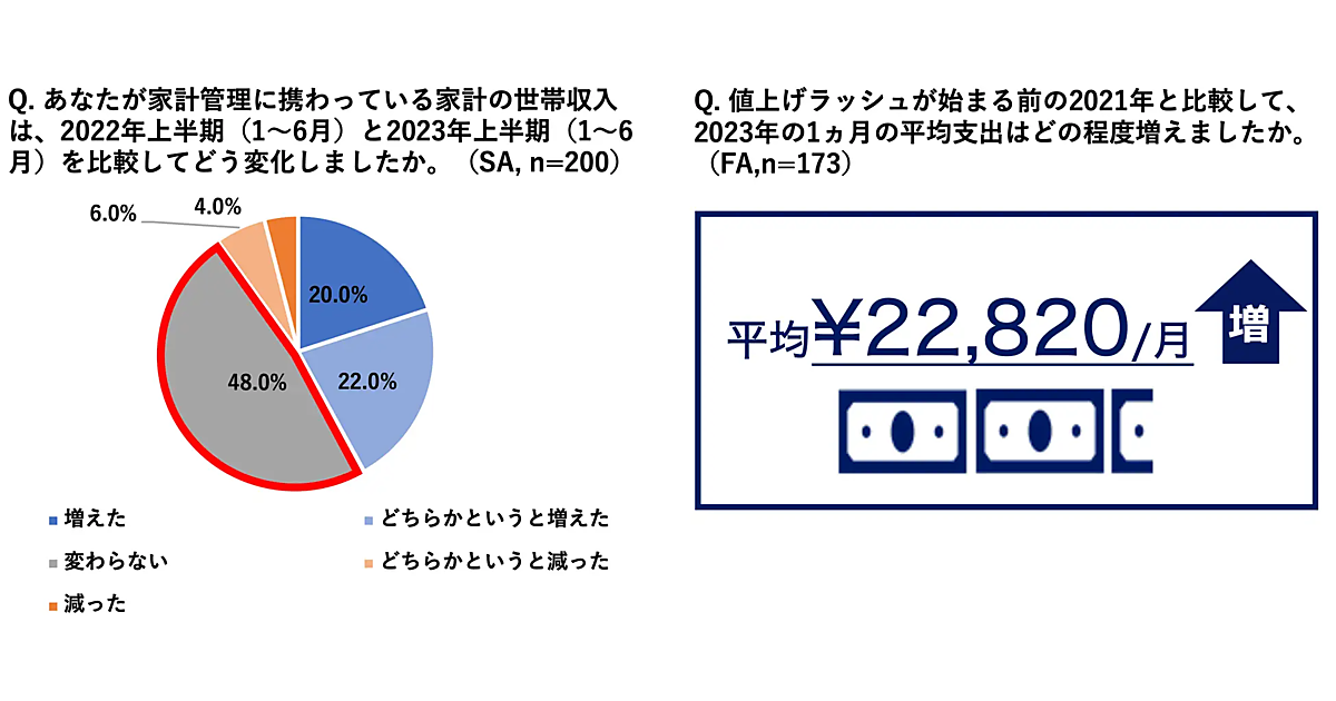 一方で、世帯収入の変化としては、48.0%の人が「変わらない」と回答。2021年の1ヵ月の平均支出と比較して、2023年の1ヵ月の平均支出がどの程度増えたか聞いたところ、平均で22,820円増加していることがわかった。