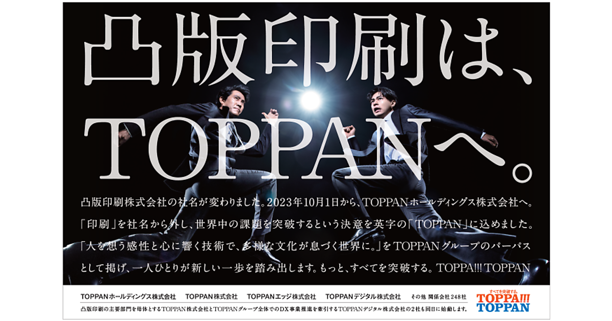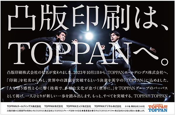 凸版印刷は1900年に創業した印刷大手。IT技術の進展に伴う社会ニーズの変化に対応し、近年は事業のデジタル化を推進。DXの分野に力を入れ、メタバース(仮想空間)も展開している。今回社名から「印刷」を外し、世界中の課題を突破する決意を英字の「TOPPAN」に込めた。「凸版印刷は、TOPPANへ。」をキャッチコピーにした広告キャンペーンを実施する。
