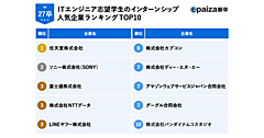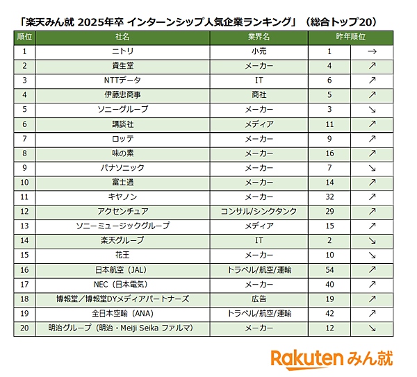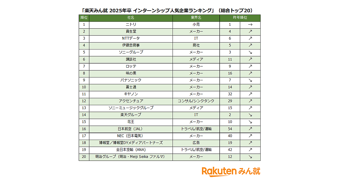 楽天グループは、「楽天みん就2025年卒 インターンシップ人気企業ランキング」を発表した。2025年卒業予定の学生1,783人が回答している。「プログラムがおもしろい」「業界研究ができる」「仕事理解ができる」「プログラムのレベルが高い」「成長できる」「スキルが身につく」「先輩に勧められた」の7つの観点から3つの志望理由を選んで回答し、ポイントを集計した。