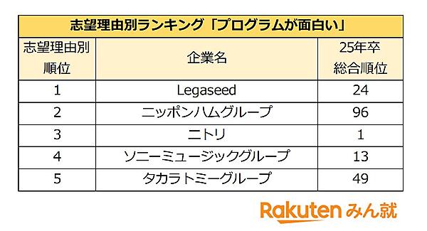 志望理由別ランキングにおける「プログラムがおもしろい」の項目を見ると、1位の「Legaseed」を筆頭に、「ニッポンハムグループ」「ニトリ」「ソニーミュージックグループ」などは右肩上がりとなっており、学生が重視する項目のようだ。