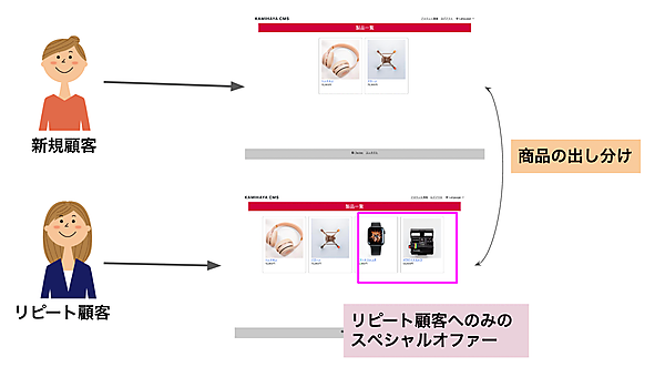 API設定画面には最終アップデート時間が表示され、現在の情報がいつ時点のデータか分かる。最終データ更新時間を変更すると、次の取り込み基準時間が変えられる。データモデル管理画面も備える。出し分け機能は、非会員・会員で表示内容を変えたり、会員セグメントを事前に登録したうえで会員のランク別に表示内を変えたりできる。