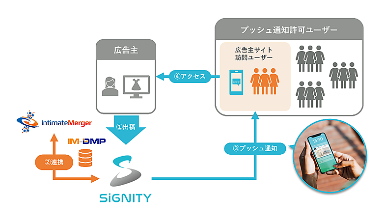 リタゲプッシュ通知は、クライアントのサイトを訪問したユーザーの行動ログをIMが分析し、結果をシグニティのPUSH ONEと連携させることで、従来のスマホロック画面広告よりターゲティングの精度を高める。プッシュ通知形式の広告アプローチによってサイトを訪れていない状態のターゲットユーザーに商品の情報を知らせ、広告主のウェブページに誘導できる。