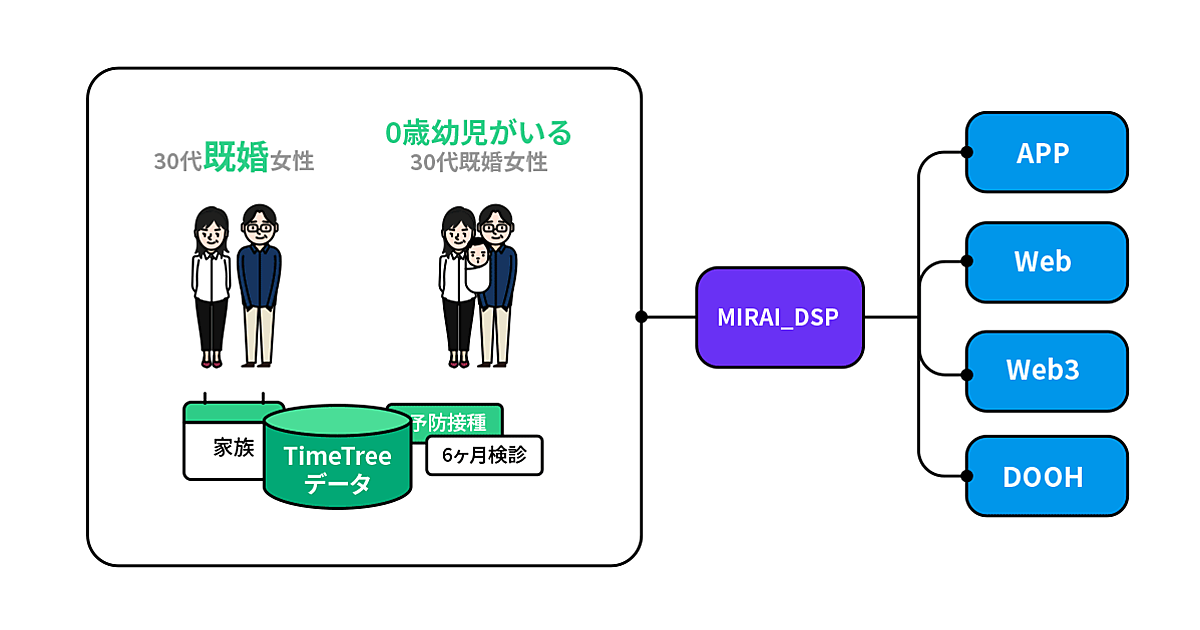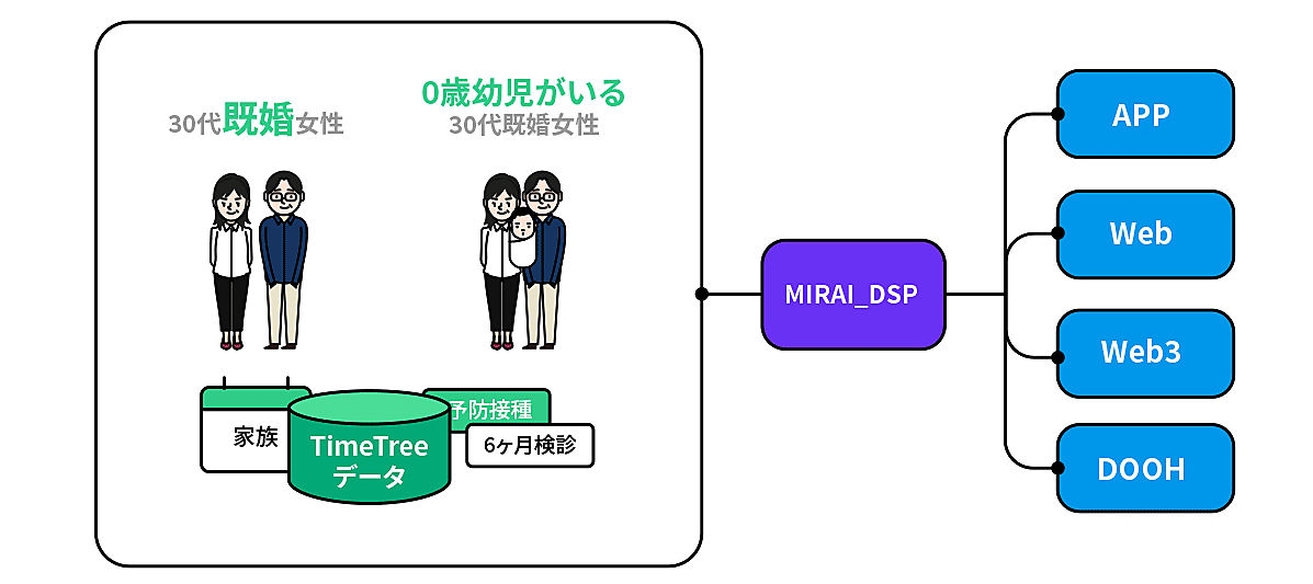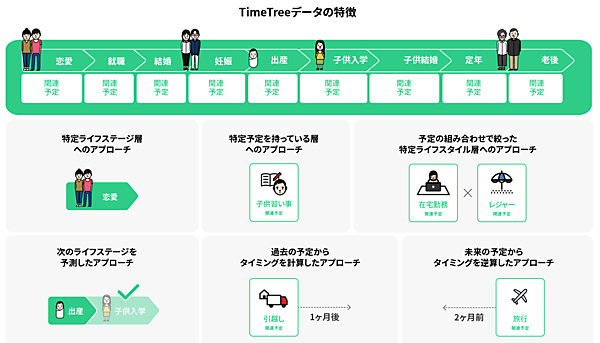 DACの広告プラットフォームを活用し、ユーザーのモーメント(興味・関心が最も高まる時)を捉えて広告配信する。行動や購買を予測するアルゴリズムで生成したセグメントに配信。アルゴリズムは、TimeTreeユーザーがカレンダーに登録した今後の計画などの「未来データ」を使い、特定の日時や購入・サービス利用のタイミングなど行動を予測する。