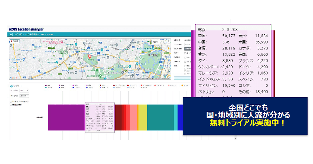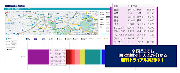 エリアマーケティングGIS(地図情報システム)開発・販売の技研商事インターナショナルは、KDDIと共同開発した位置情報分析GIS「KDDI Location Analyzer」に、インバウンド(訪日外国人)の人流分析ダッシュボードサービス「KDDI Location Analyzer(訪日外国人版)Powered by NAVITIME」を搭載した、と10月4日発表した。同日に提供を始めた。
