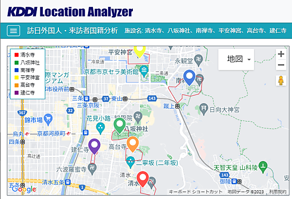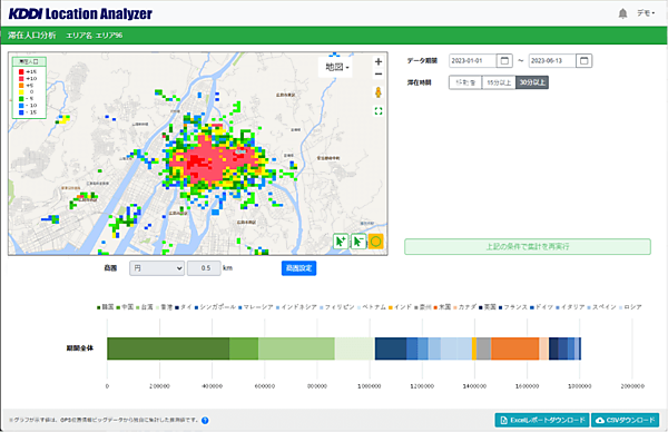 ウェブブラウザで操作する。コロナ禍の前後など期間の比較も可能。特定エリア、施設単位でのインバウンド人流・動態分析や、行政区界単位での分布分析、任意で設定した6地点・6施設の同時分析ができる。KDDI Location Analyzerは全機能使い放題のサブスクリプション(定額課金)で、12月31日までに利用を始めると料金を最大約30%割り引く。
